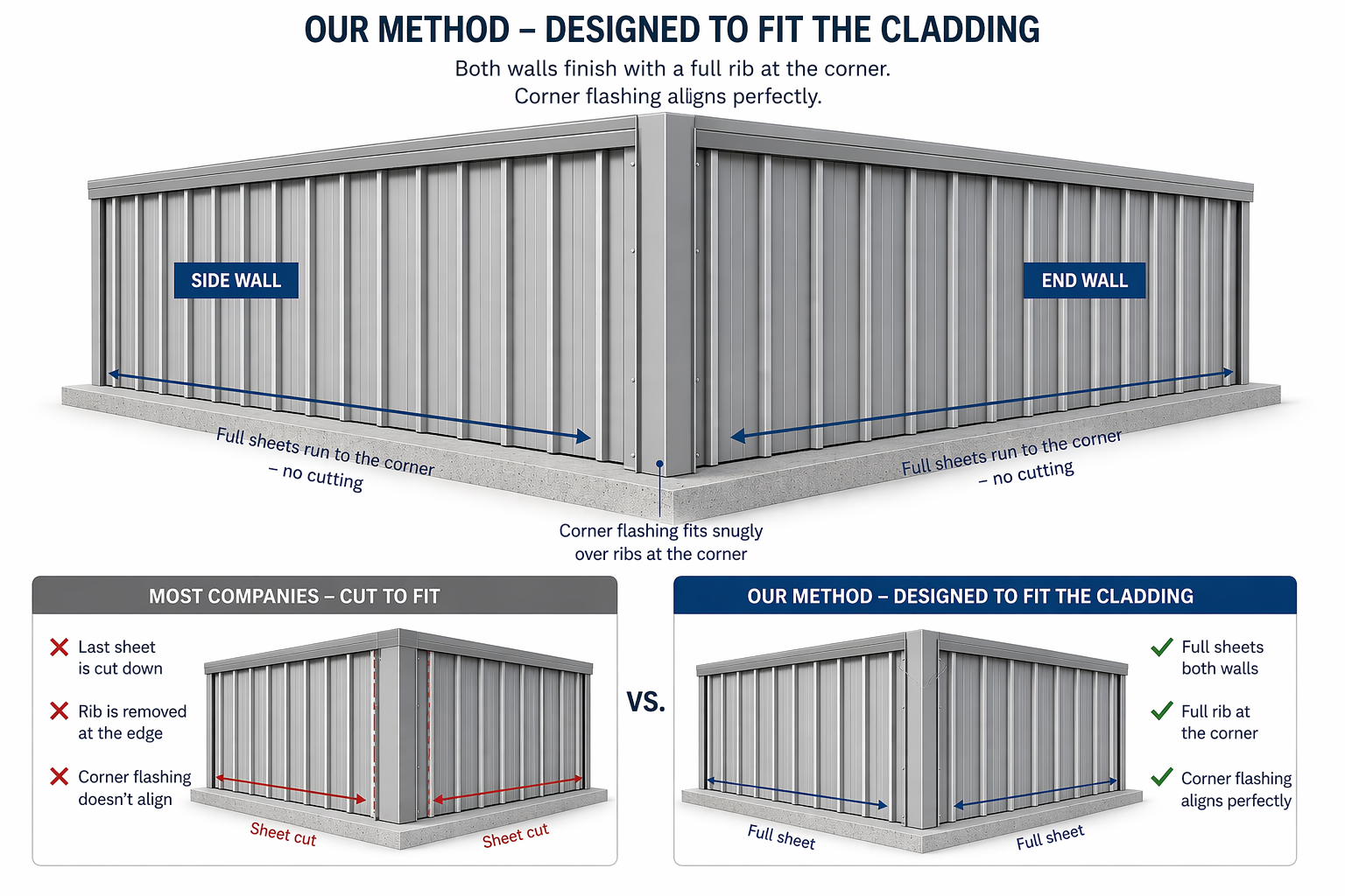 “We do it differently. We design the shed to match the exact width of the cladding sheets.”